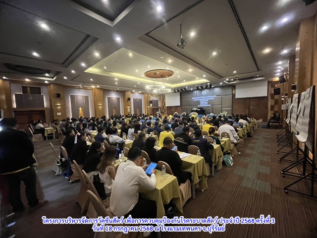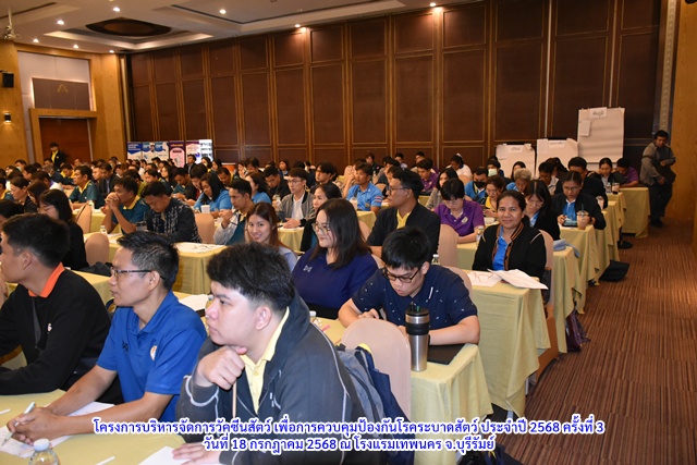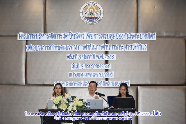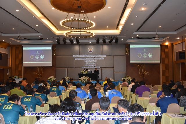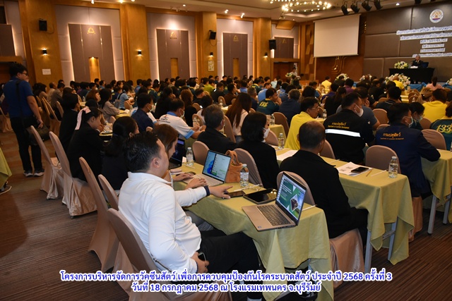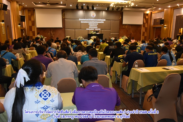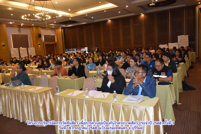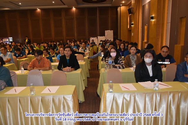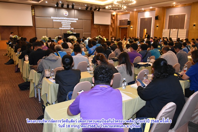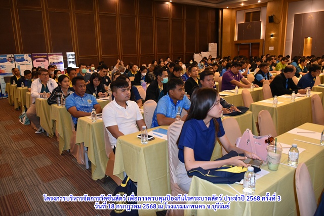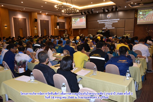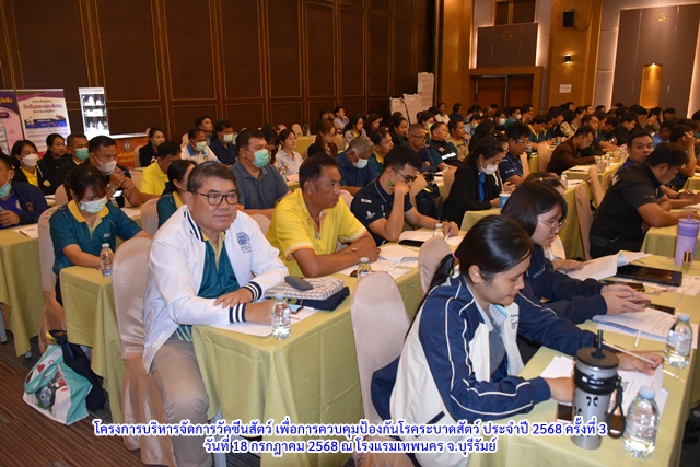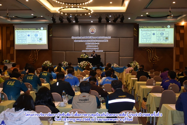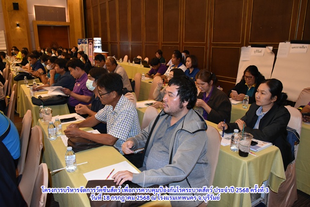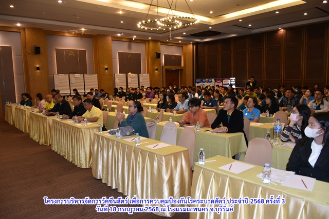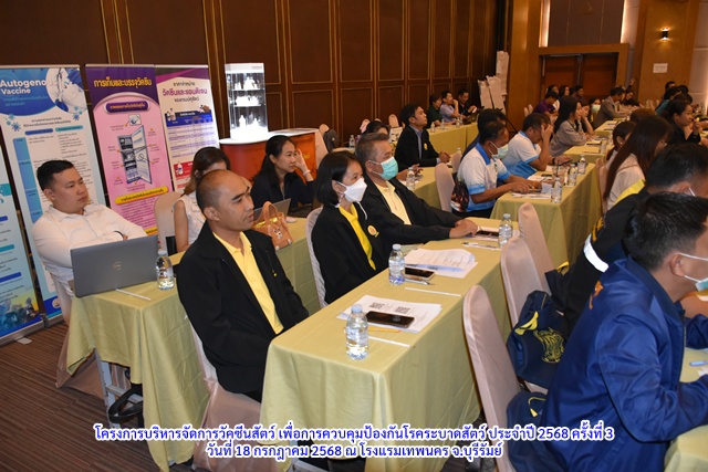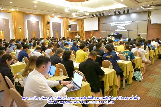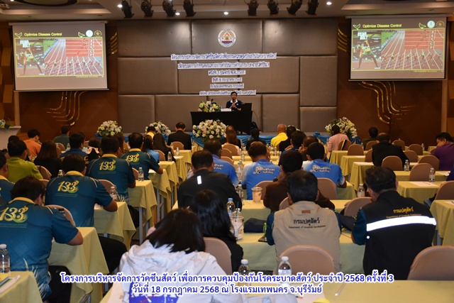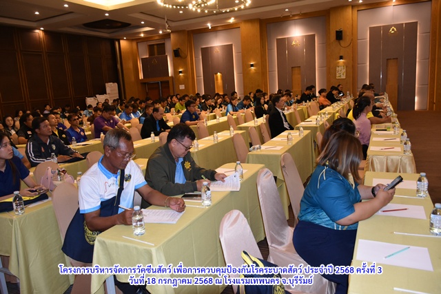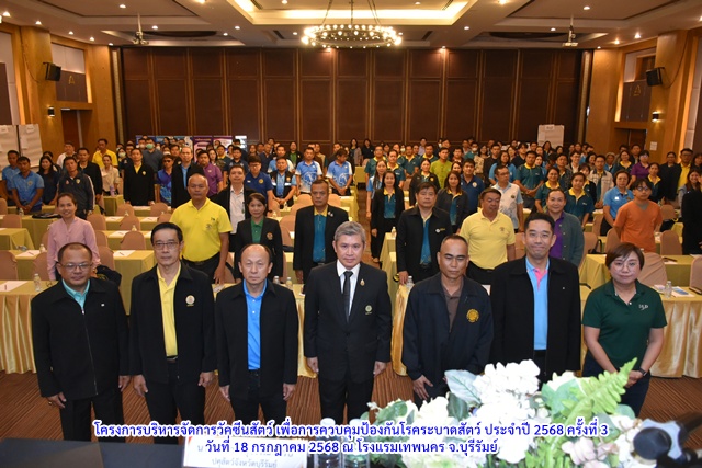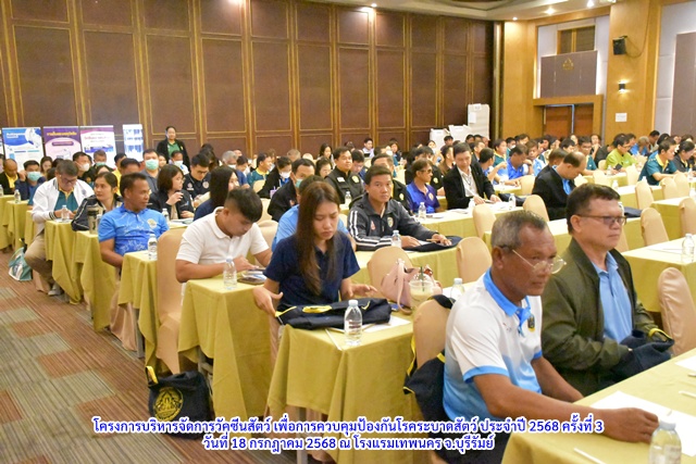 วันที่ 18 กรกฎาคม 2568 นายสัตวแพทย์อดิศร ชาติสุภาพ ปศุสัตว์เขต 3 มอบหมายให้ นายสัตวแพทย์อภิชาติ สุวรรณชัยรบ ปศุสัตว์จังหวัดบุรีรัมย์ เป็นประธานเปิดการโครงการบริหารจัดการวัคซีนสัตว์เพื่อการควบคุมป้องกันโรคระบาดสัตว์ ประจำปี พ.ศ.2568 ครั้งที่ 3 จัดโดยสำนักเทคโนโลยีชีวภัณฑ์สัตว์ การจัดโครงการฝึกอบรมในครั้งนี้มีวัตถุประสงค์เพื่อการติดตาม ประเมินผล และวิเคราะห์สถานการณ์การใช้วัคซีนสัตว์ และเพื่อเพิ่มประสิทธิภาพการเบิกจ่ายวัคซีนให้ครอบคลุมและแม่นยำตามความต้องการในพื้นที่ และมีกลุ่มเป้าหมายเป็นเจ้าหน้าที่กรมปศุสัตว์ในสำนักงานปศุสัตว์เขต ปศุสัตว์จังหวัด ปศุสัตว์อำเภอ และอาสาปศุสัตว์ ในพื้นที่ปศุสัตว์เขต 3 ณ โรงแรม เทพนคร จังหวัดบุรีรัมย์